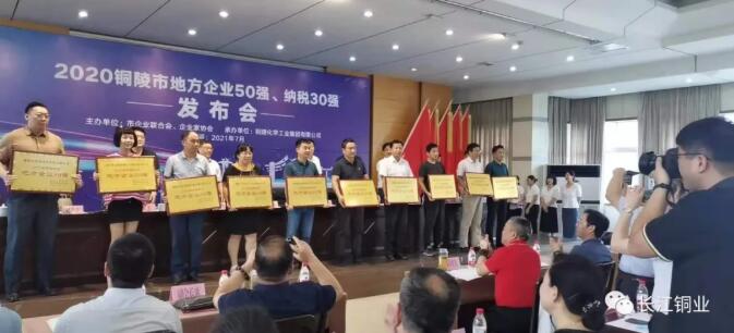 2021年7月6日下午,由市企業(yè)聯(lián)合會、市經(jīng)信局、市稅務(wù)局聯(lián)合舉辦的2020年度銅陵市“地方企業(yè)50強(qiáng)”“納稅30強(qiáng)”發(fā)布會在銅化集團(tuán)會議室隆重召開。副市長王綱根,市老領(lǐng)導(dǎo)、市“四會”創(chuàng)始會長唐世定,市委宣傳部副部長章祎,市中小企業(yè)局局長朱永平,市稅務(wù)局黨委委員、副局長李軍等領(lǐng)導(dǎo)出席會議。發(fā)布會上,我司被授予“2020年度銅陵市地方企業(yè)50強(qiáng)”的榮譽(yù)稱號!