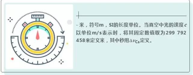 - 米,符號(hào)m,SI的長(zhǎng)度單位。當(dāng)真空中光的速度c以單位m/s表示時(shí),將其固定數(shù)值取為299 792 458來定義米,其中秒用DnCs定義。