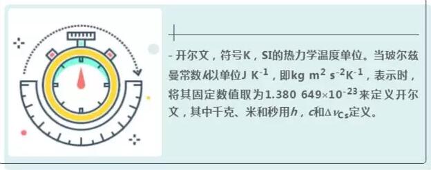 - 開爾文,符號(hào)K,SI的熱力學(xué)溫度單位。當(dāng)玻爾茲曼常數(shù)k以單位J K-1,即kg m2 s-2K-1,表示時(shí),將其固定數(shù)值取為1.380 649′10-23來定義開爾文,其中千克、米和秒用h,c和DnCs定義。